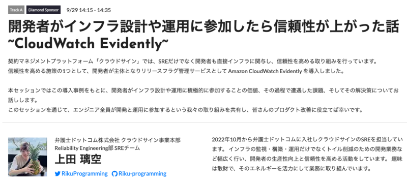 14:15〜14:35にTrackAにてクラウドサイン SREチームの上田が、『開発者がインフラ設計や運用に参加したら信頼性が上がった話~CloudWatch Evidently~』というテーマで登壇いたします。