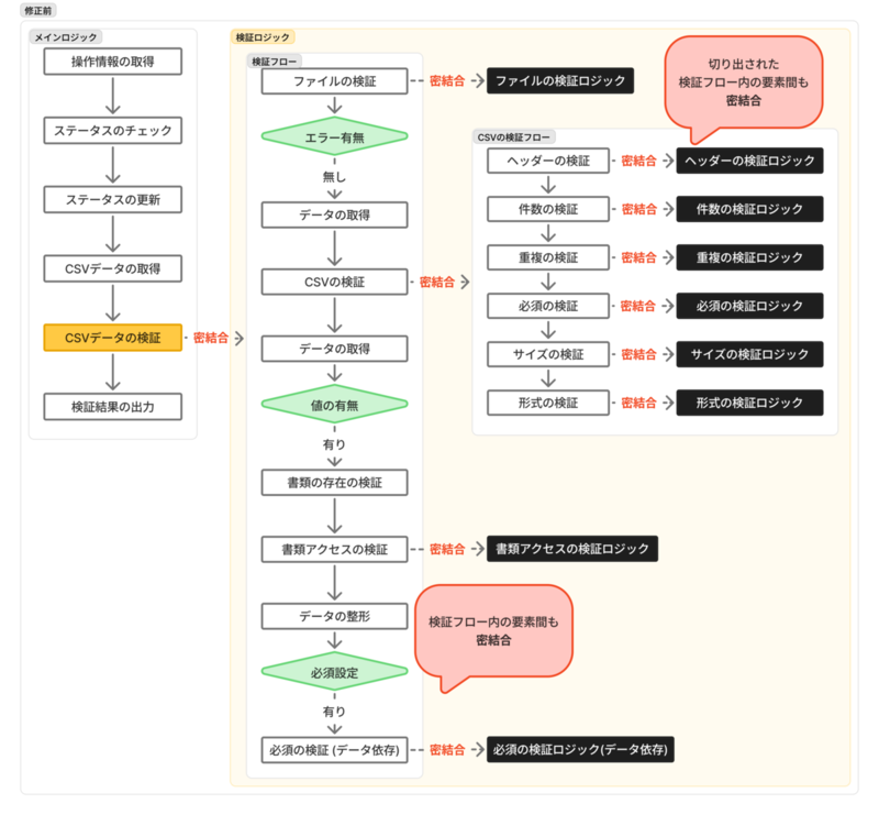 検証ロジック・入力データの整形・処理順序の指定・処理中断の分岐、といった目的の異なる処理が 1 つの処理にまとまって記述されています。 また検証ロジックの分割についても同じ粒度で行われておらず、機能を追加する際にどこへ何を書くと良いか分かりにくくなっています。 複数の目的の処理が混ざって依存している状態だと、それを読み解いて修正または拡張する難易度が高くなります。